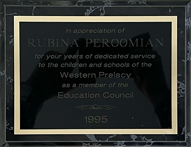 Dr. Rubina Peroomian’s profile was featured at the UCLA Armenian Graduate Students Association website beginning from May 15, 2003. The Mesrob Mashtots Medal of Honor with a formal encyclical of His Holiness Aram I Catholicos of the Holy See of Cilicia, granted by Arch. Moushegh Mardirossian, Prelate of the Armenian Apostolic Church of Western United States, on October 10, 1999, in Glendale, California. |