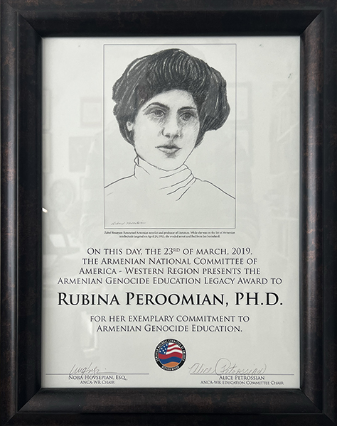 | “Prof. Rubina Peroomian, for her Contribution to Orphans of the Genocide” given by Armenoid Production. The film was released on 2013. | ![]() |