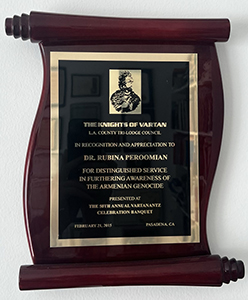 | The Knights of Vartan, L.A. County Tri-lodge Council Award in “Recognition and Appreciation for Distinguished Service in Furthering Awareness of the Armenian Genocide,” February 21, 2015. | ![]() |