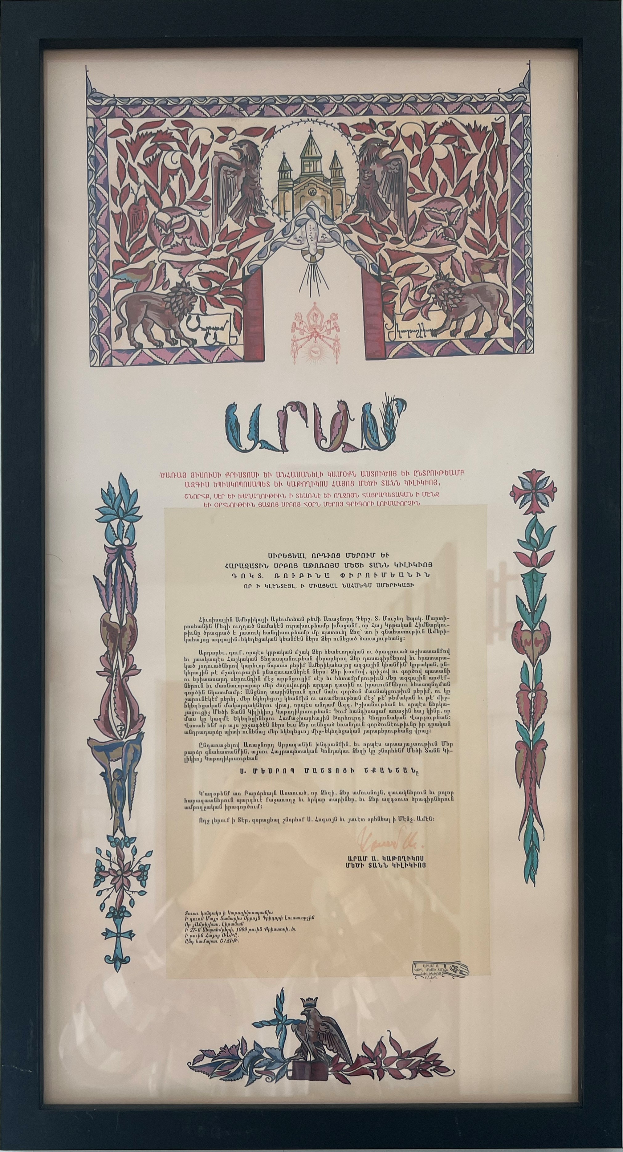 Dr. Rubina Peroomian’s profile was featured at the UCLA Armenian Graduate Students Association website beginning from May 15, 2003. The Mesrob Mashtots Medal of Honor with a formal encyclical of His Holiness Aram I Catholicos of the Holy See of Cilicia, granted by Arch. Moushegh Mardirossian, Prelate of the Armenian Apostolic Church of Western United States, on October 10, 1999, in Glendale, California. |