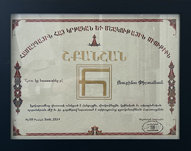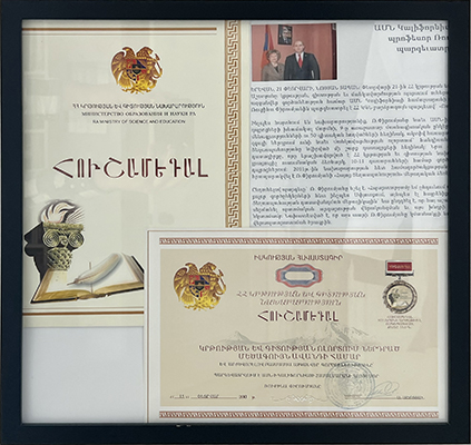 | Medal of Honor (Բարձրագոյն Շքանշան) and Certificate granted by Hamazkayin – Armenian Educational and Cultural Society Central Committee, April 6, 2024. | ![]() |